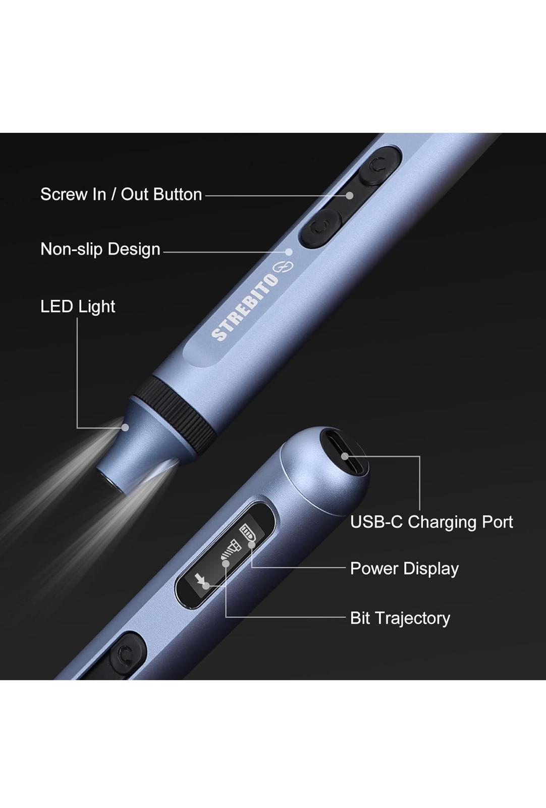 Ergonomic Design: The pen-style body ensures comfort with a non-slip grip. A magnetic tip securely holds screws, and the LED display shows rotation and battery status. Dual LEDs illuminate dark areas for accurate, efficient work