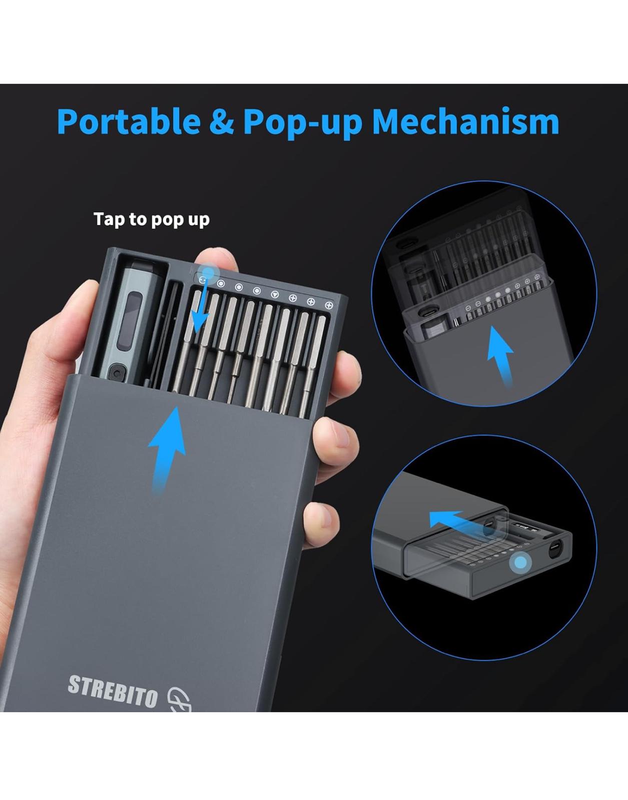 Quality First: This mini power screwdriver set features a one-click pop-up mechanism for a compact size while comeing with a magnetic case to secure parts in an organized manner. Each bit is made of high-quality S2 steel with a hardness of 60 HRC