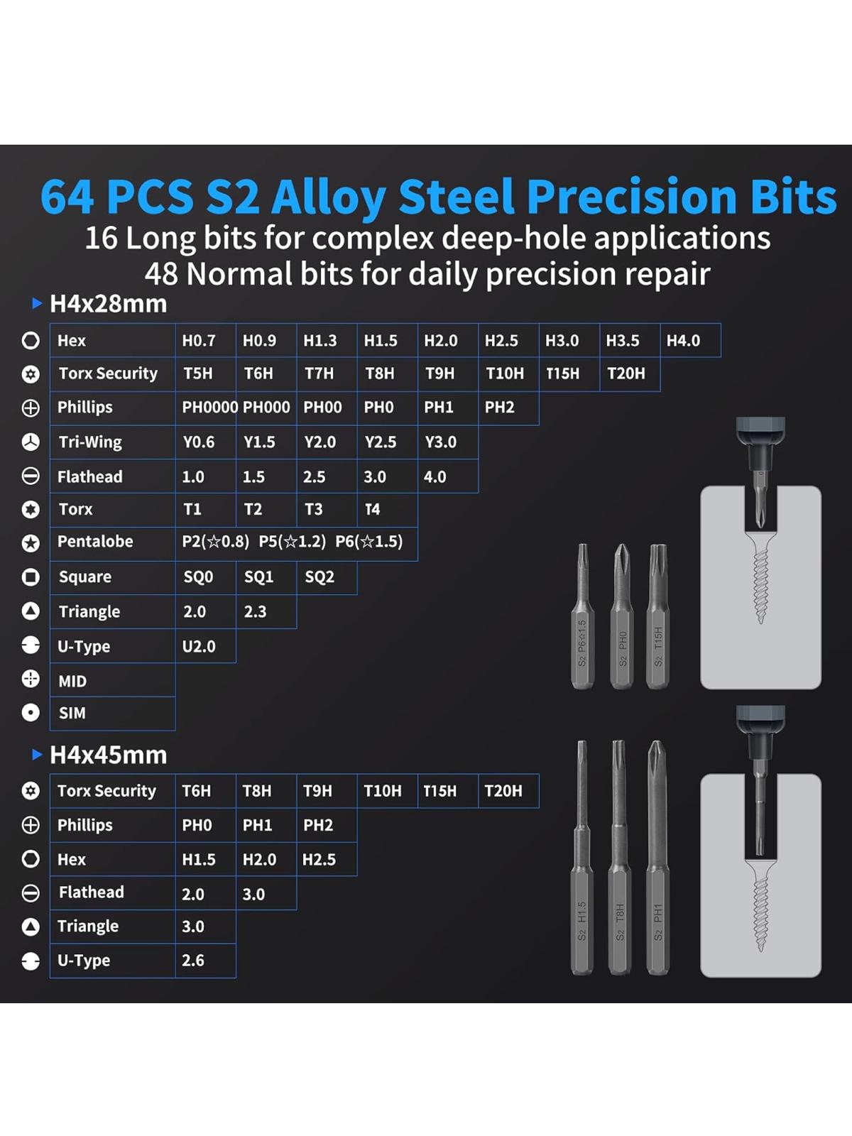 Wide Application: Equipped with 64 precision bits( Phillips, Torx, Flathead, Triwing, Hex, Pentalobe, Triangle, etc.), the electric screwdriver set can satisfy all your demands, includes PC, Computer, Laptop, Cell Phone, Macbook, RC Car, Camera and more