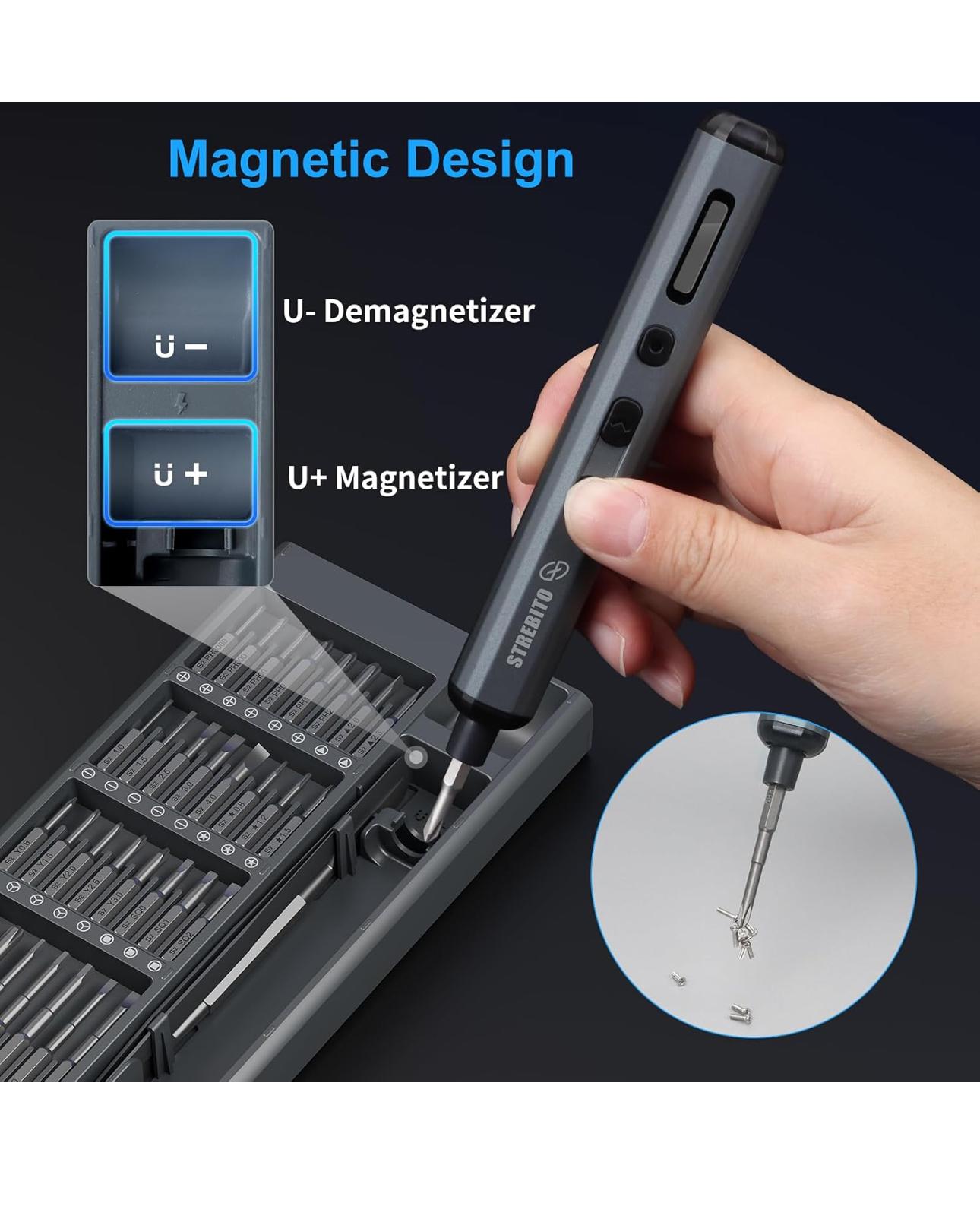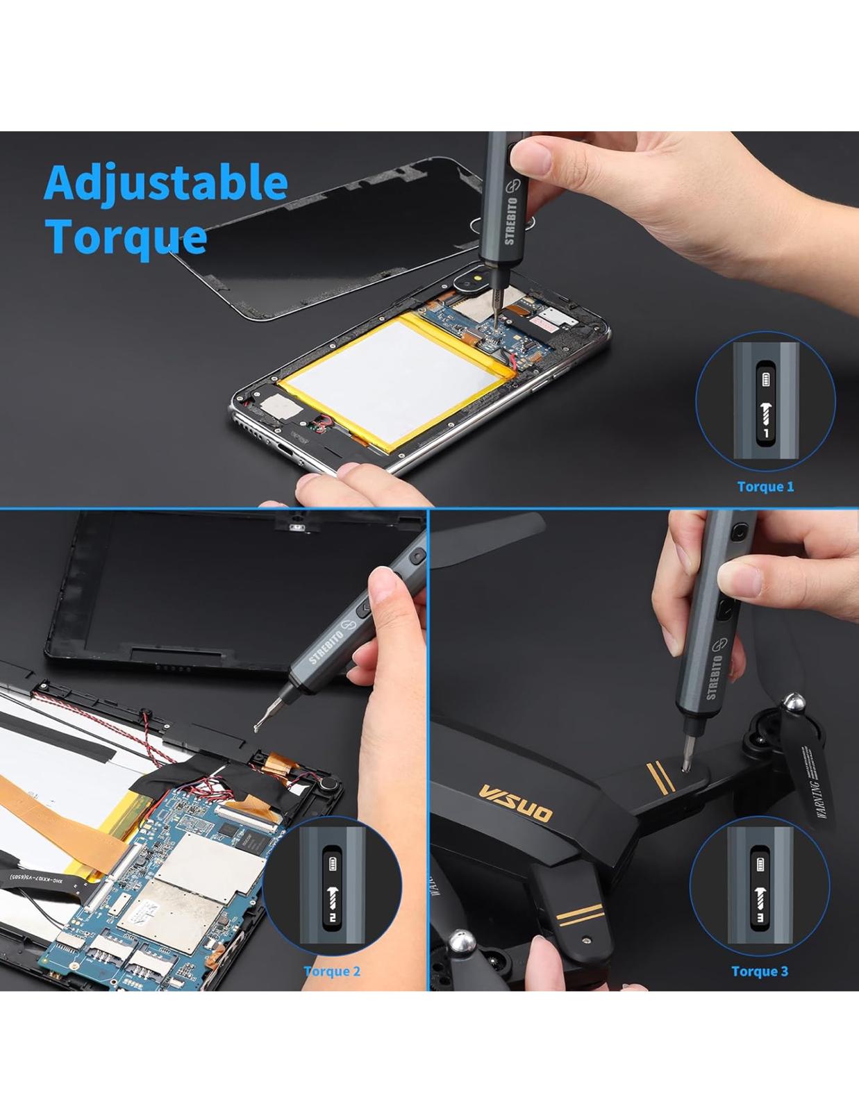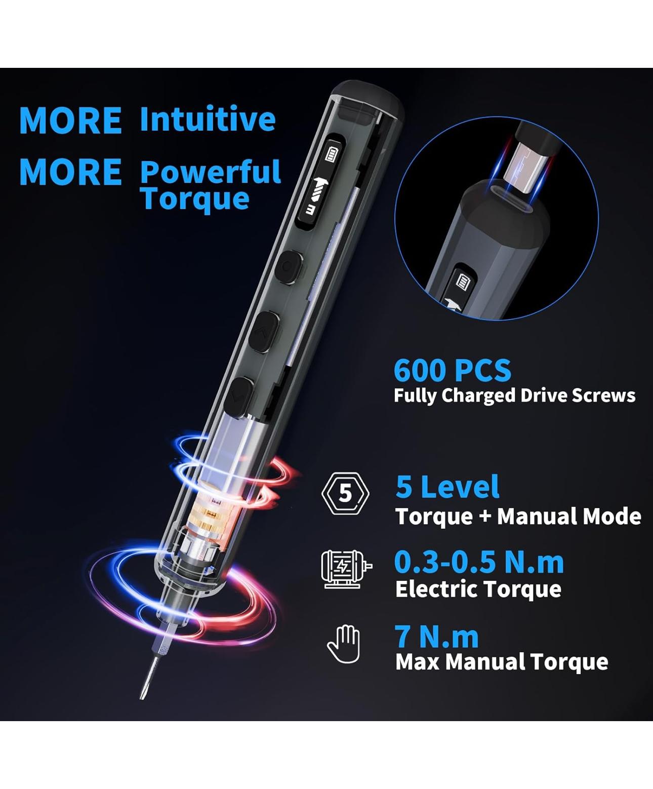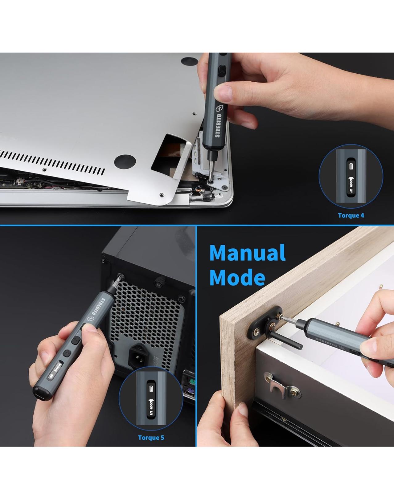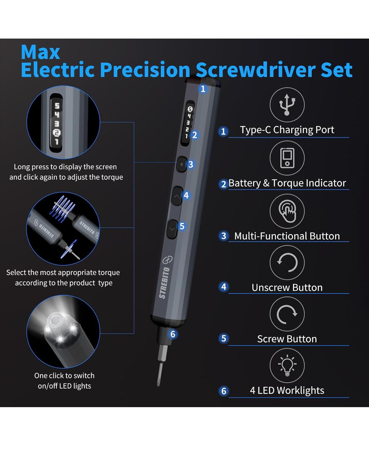 5 Upgraded Torque: Our STREBITO mini electric screwdriver is equipped with a 5-Speed automatic torque ranging from 0.3-0.5 N.m and supports manual torque up to 7 N.m. The improved digital display can help you do better precision electronic repair work