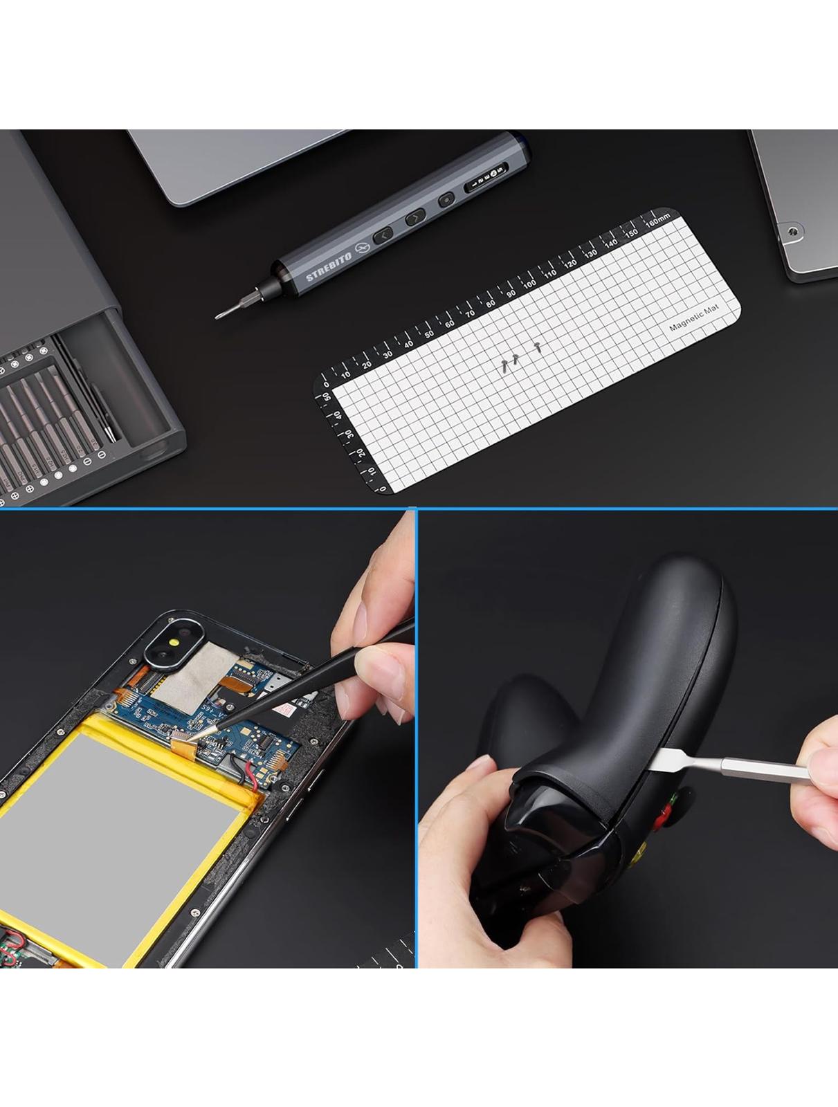 Humanized Design: Our precision electric screwdriver is ergonomically designed in a pen shape, making it lightweight, balanced and comfortable for continuous use. Pry bar, 4 built-in LED lights, tweezers, and magnetic pad help your repair work go smoothly